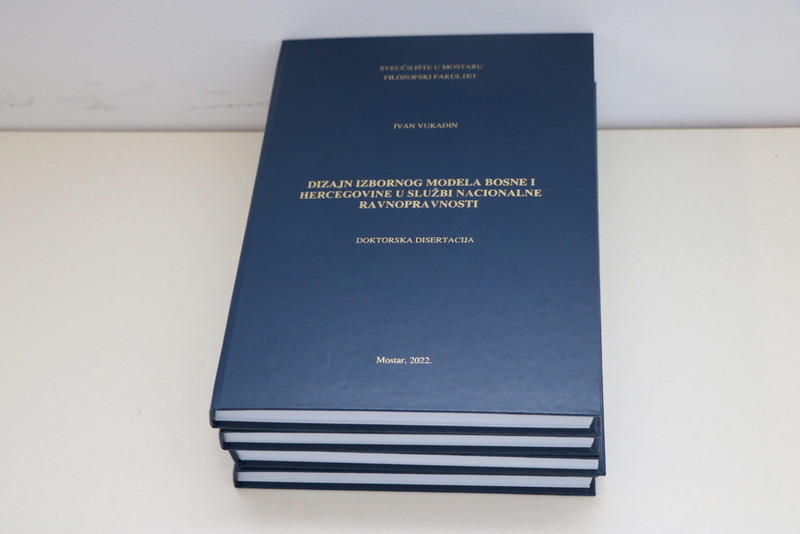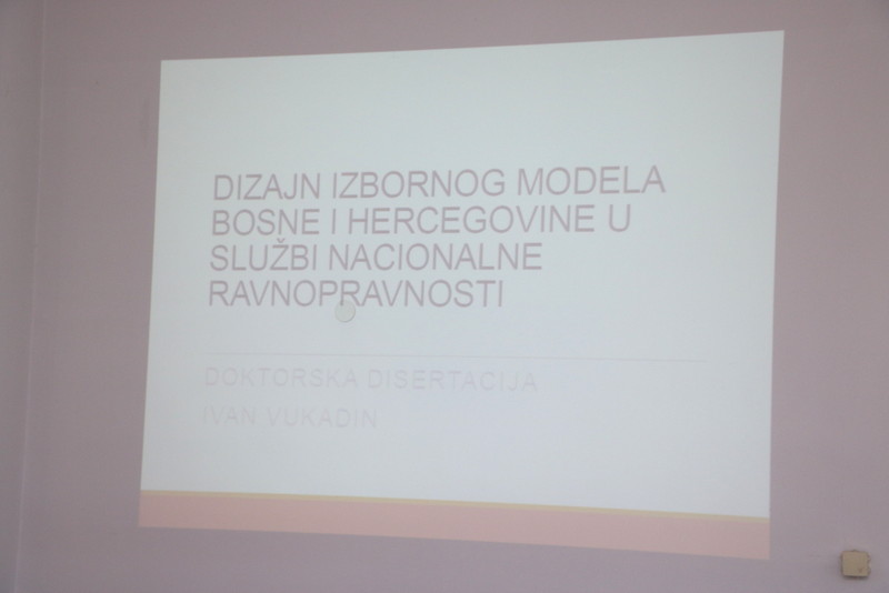 Na Filozofskom fakultetu Sveučilišta u Mostaru doktorsku disertaciju pod naslovom „Dizajn izbornog modela Bosne i Hercegovine u službi nacionalne ravnopravnosti“ danas je obranio Ivan Vukadin. Disertaciju je obranio pred tročlanim povjerenstvom koje su činili dr. sc. Božo Skoko, prof. dr. sc. Gordana Iličić i akademik profesor emeritus Božo Žepić.
