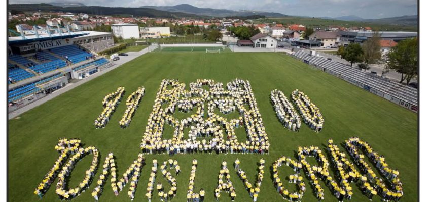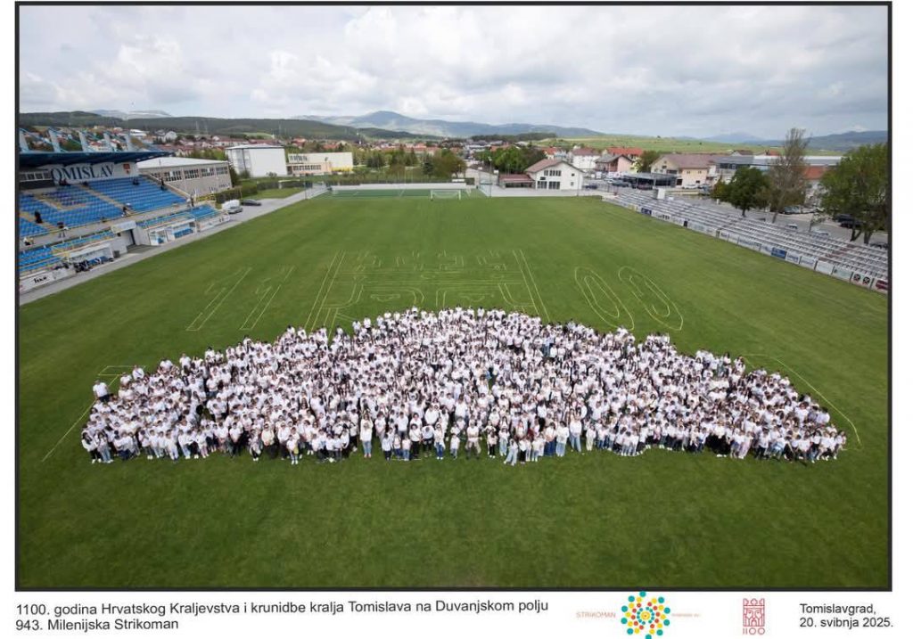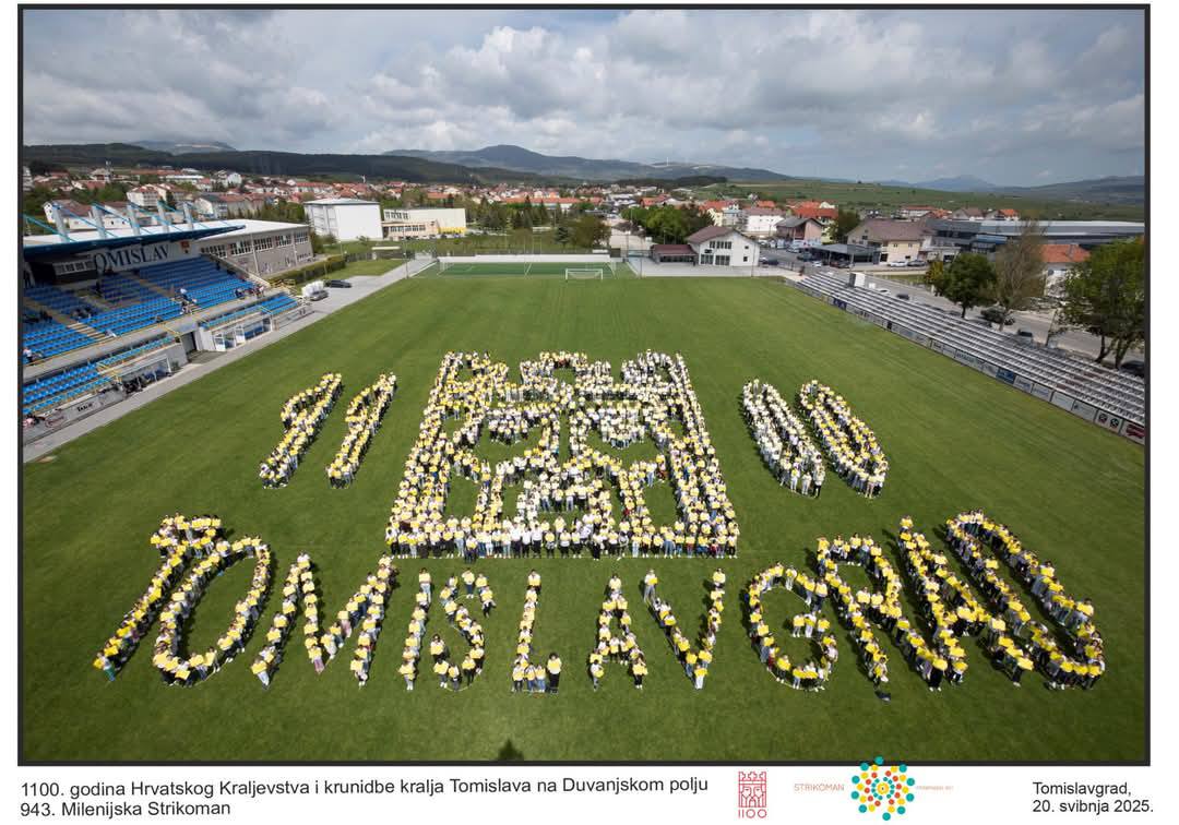 Djeca, raspoređena na travnjaku stadiona, svojim tijelima formiraju logo, broj “1100” i natpis “Tomislavgrad” čime vizualno dočaravaju veličinu i značaj ove obljetnice za hrvatsku povijest, ali i za lokalnu zajednicu. Fotografija koju snima proslavljeni hrvatski fotograf Šime Strikoman ostat će trajna uspomena na ovu veliku obljetnicu.