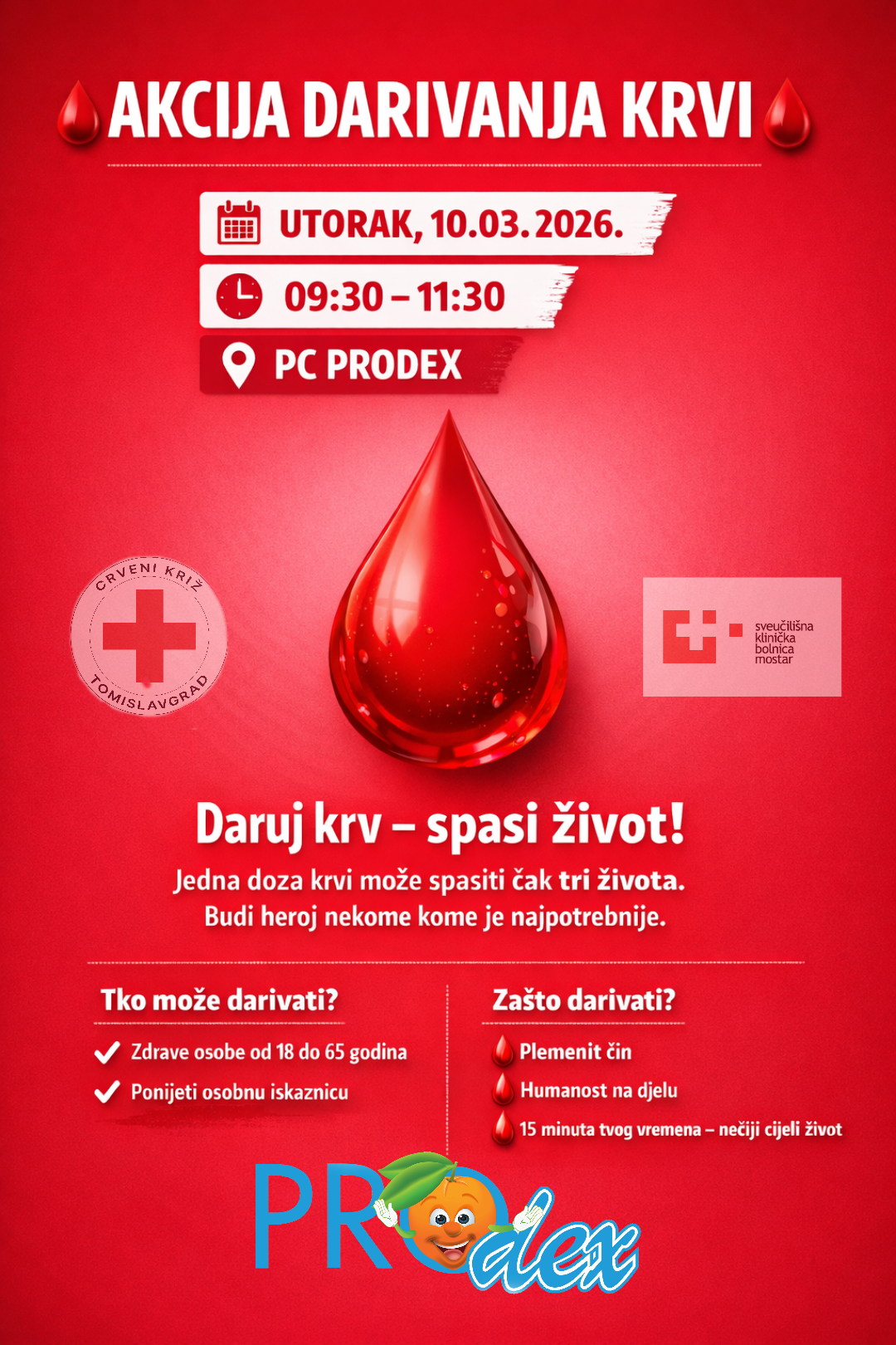 Akcija dobrovoljnog darivanja krvi će se održati u utorak, 10. ožujka 2026. godine, u vremenu od 09:30 do 11:30 sati u Prodajnom centru Prodex.