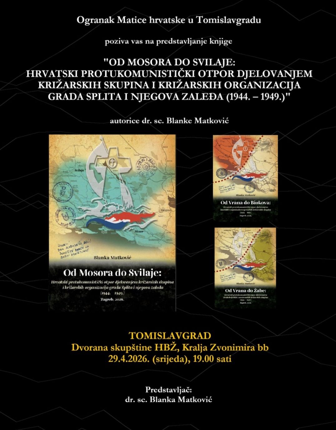 Ogranak Matice hrvatske u Tomislavgradu i Hrvatska družba povjesničara „Dr. Rudolf Horvat“ pozivaju vas na predstavljanja nove knjige koju pod naslovom „Od Mosora do Svilaje: Hrvatski protukomunistički otpor djelovanjem križarskih skupina i križarskih organizacija grada Splita i njegova zaleđa (1944.-1949.)” potpisuje dr. sc. Blanka Matković.