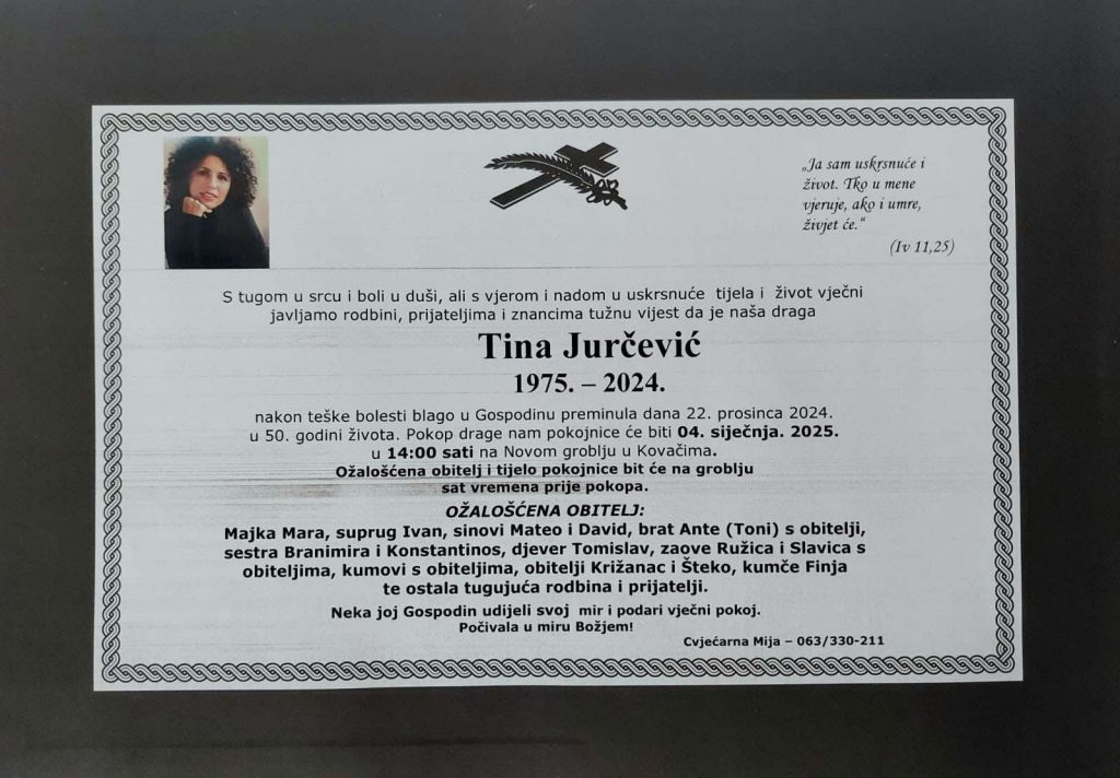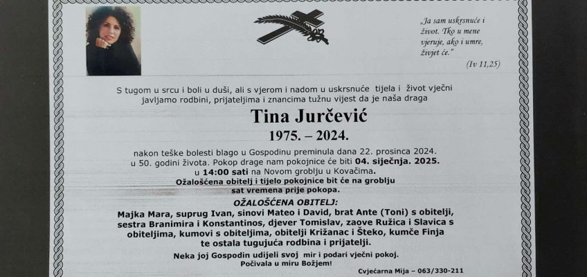 Nakon teške bolesti u Njemačkoj je 22. prosinca preminula Tina Jurčević rođ. Šumanović (kći pok. Stipana Ćipe i Mare iz Mandina Sela).