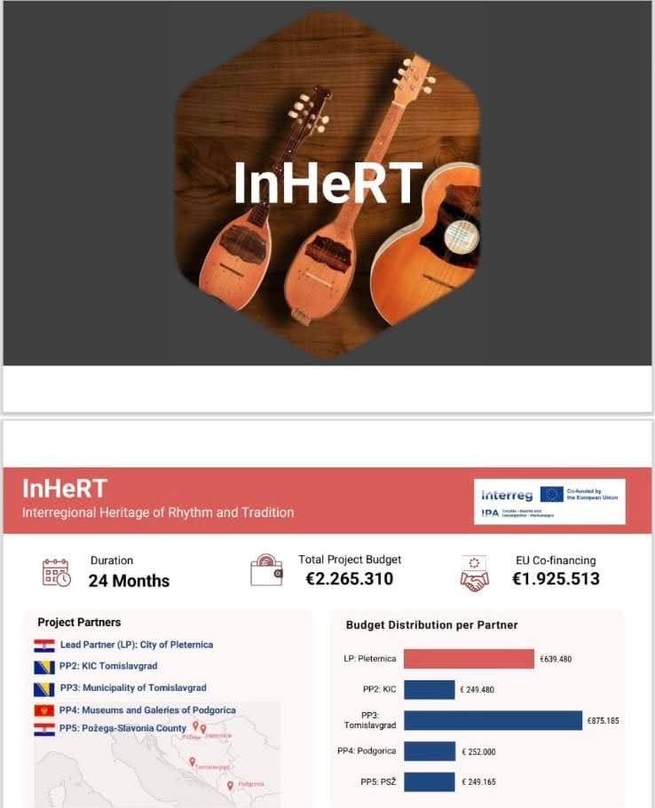 Nakon uspješno provedenog projekta “Kulturna ruta bećarca i gange” partnerstvo Pleternice i Tomislavgrada ponovno je revitalizirano odobrenim sredstvima za novi projekt “InHeRT (Interregional Heritage of Rhythm and Tradition)”.