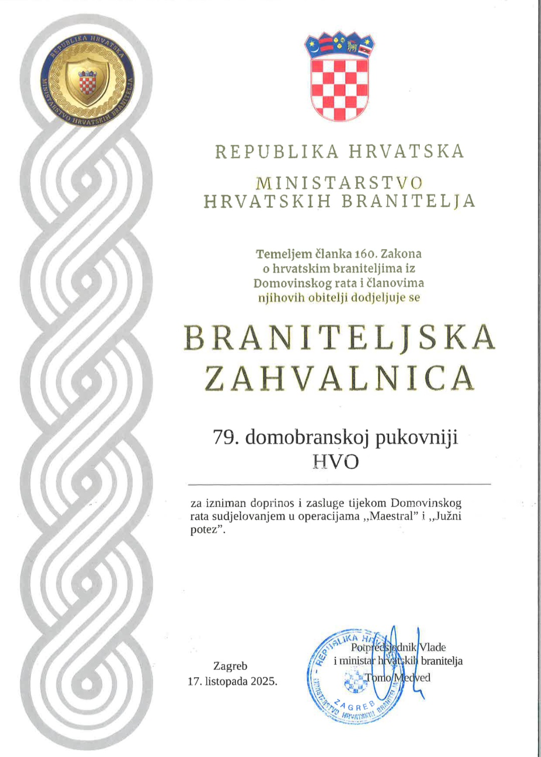 Za izniman doprinos i zasluge tijekom Domovinskoga rata, sudjelovanjem u operacijama Maestral i Južni potez braniteljska zahvalnica je dodijeljena i 79. domobranskoj pukovniji HVO-a, sljednici legendarne Brigade kralja Tomislava iz Tomislavgrada