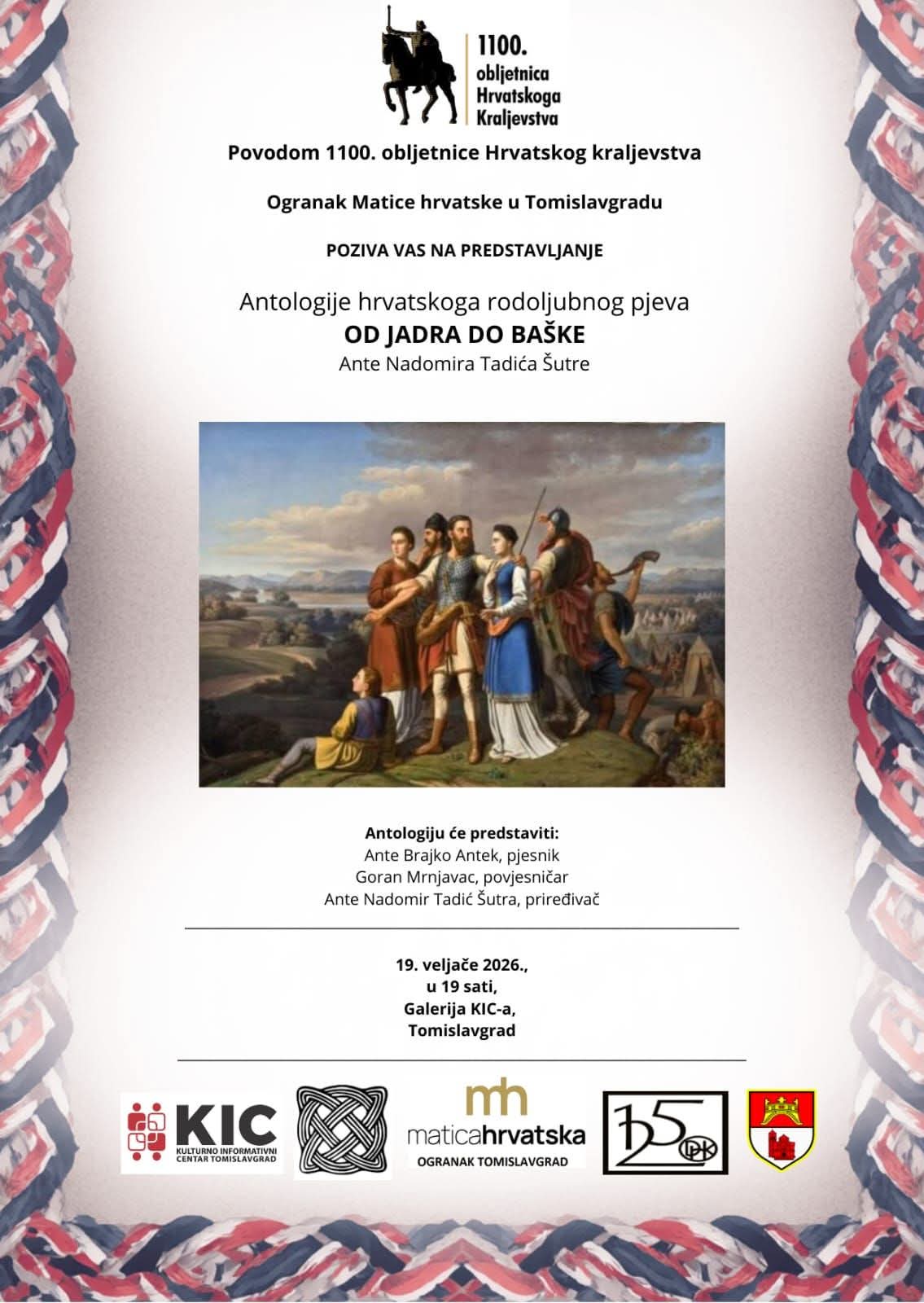 Čast nam je pozvati Vas na predstavljanje Antologije hrvatskog rodoljubnog pjeva “OD JADRA DO BAŠKE” priređivača Ante Nadomira Tadića Šutre, a kojoj je nakladnik Ogranak Matice hrvatske u Tomislavgradu uz Kninski muzej i Društvo hrvatskih književnika – ogranak Split.