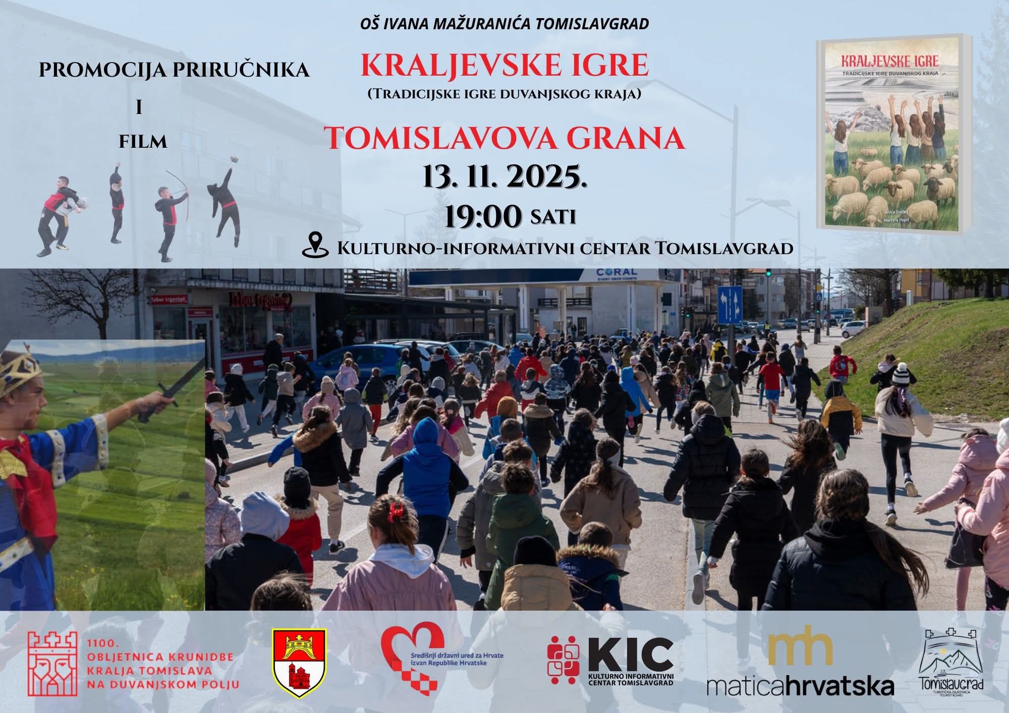 Osnovna škola Ivana Mažuranića Tomislavgrad u suradnji s KIC-om Tomislavgrad, TZ i ogrankom MH Tomislavgrad, pod pokroviteljstvom Općine Tomislavgrad i Središnjeg državnog ureda za Hrvate izvan RH u sklopu proslave 1100 obljetnice krunidbe kralja Tomislava na Duvanjskom polju poziva vas na promociju priručnika “Kraljevske igre – tradicijske igre duvanjskog kraja ” i projekciju kratkometražnog filma “Tomislavova grana.”