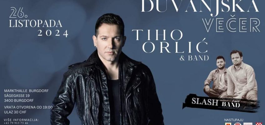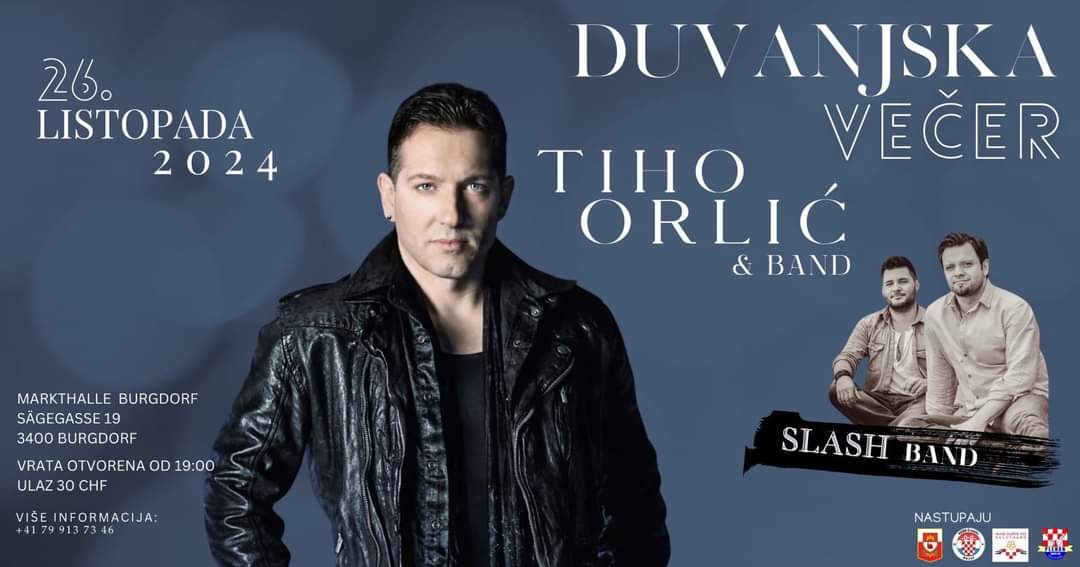 24 lis 2024 NAJAVA: Tradicionalna “Duvanjska večer” u Švicarskoj by Ivica Šarac | objavljeno u: NAJAVE | 0 U organizaciji KUD Duvanjske rose iz Berna ove subote (26. listopada) održat će se tradicionalna Duvanjska večer. Goste će zabavljati Slash band te Tiho Orlić sa svojim bandom. Ostale detalje potražite na plakatu.