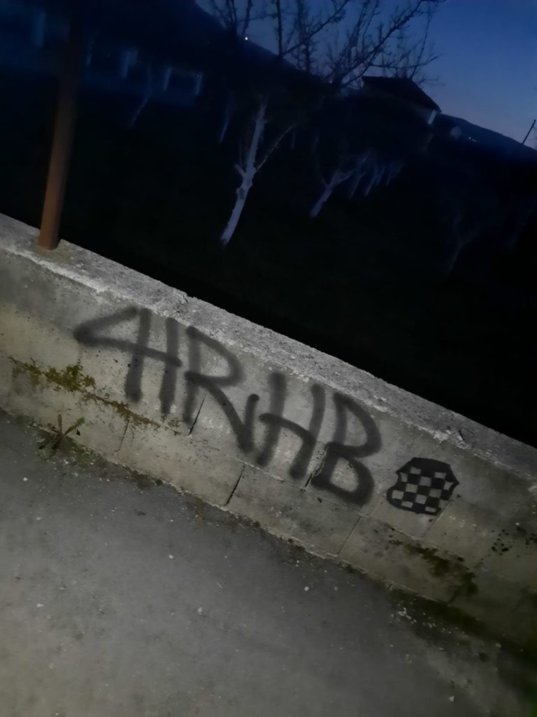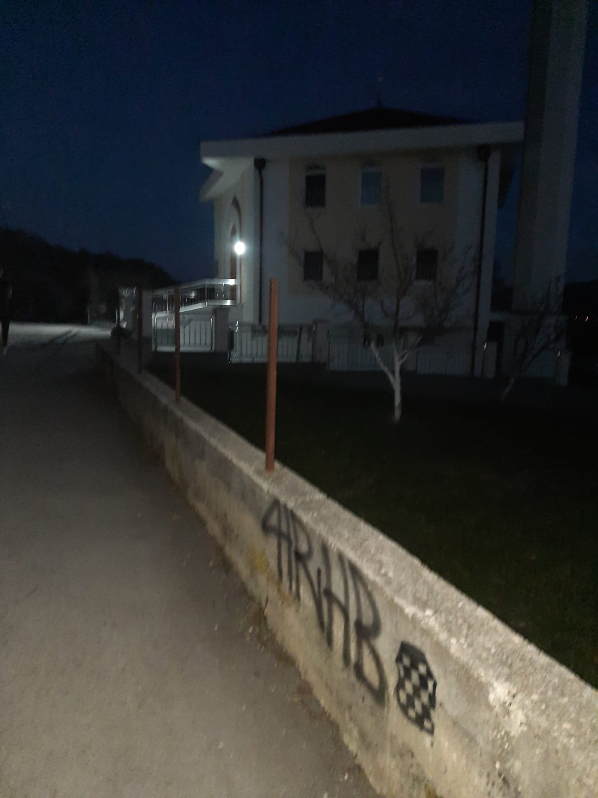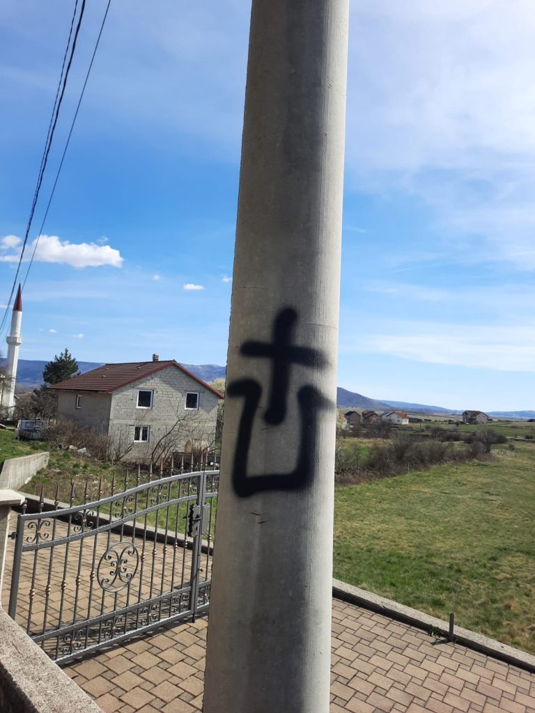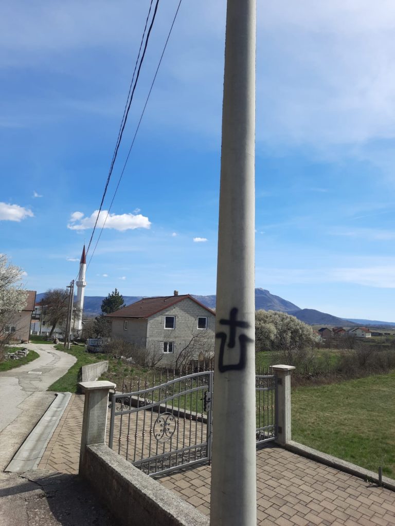 Sinoć u noći, nepoznata osoba ili više njih, išarale su zid ispred džamije u Mandinu Selu i kroz selo na elektro stupovima.