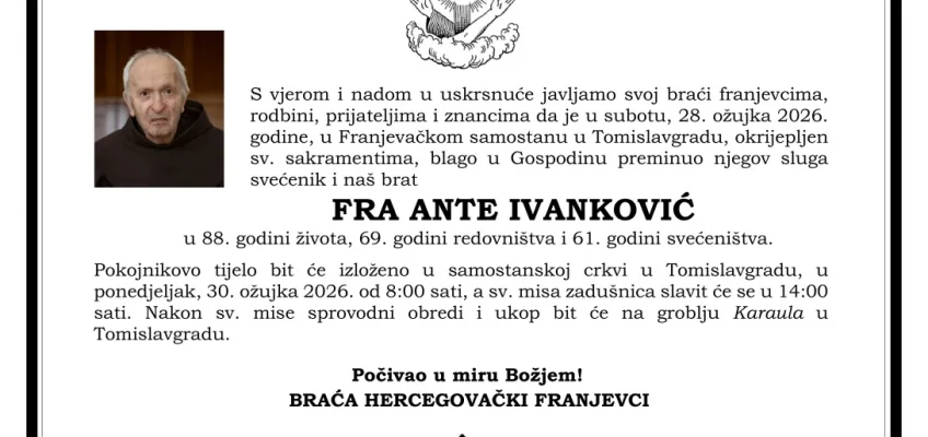 U subotu, 28. ožujka 2026. godine, u Franjevačkom samostanu u Tomislavgradu, okrijepljen sv. sakramentima, blago je u Gospodinu preminuo njegov sluga, svećenik i naš brat fra Ante Ivanković u 88. godini života, 69. godini redovništva i 61. godini svećeništva.