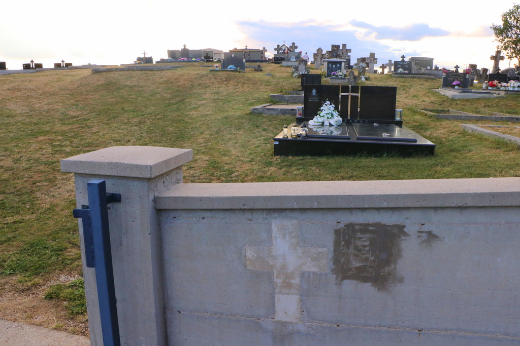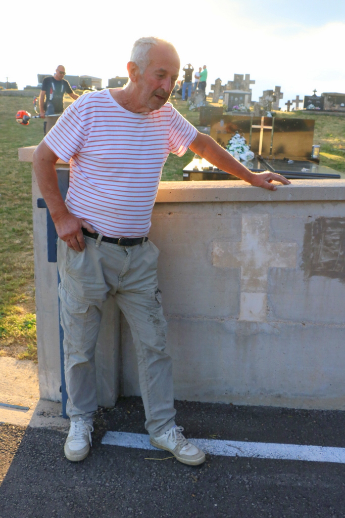 Dolaskom na groblje i tijekom današnje košnje trave zatekli smo nepoznate kamenoklesare kako rade na jednoj grobnici. Bilo ih je nekoliko a među njima jedan sjedi gospodin. Odmah smo prionuli poslu i nismo se puno zanimali jedni za druge.